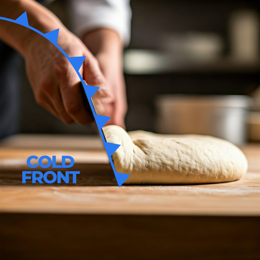 Frontal Lifting - When a cold front approaches, it acts like a bench knife, forcefully sliding underneath warm air and lifting it off of the surface. The cold front creates a sharp, well-defined lift — often producing strong, organized thunderstorms.